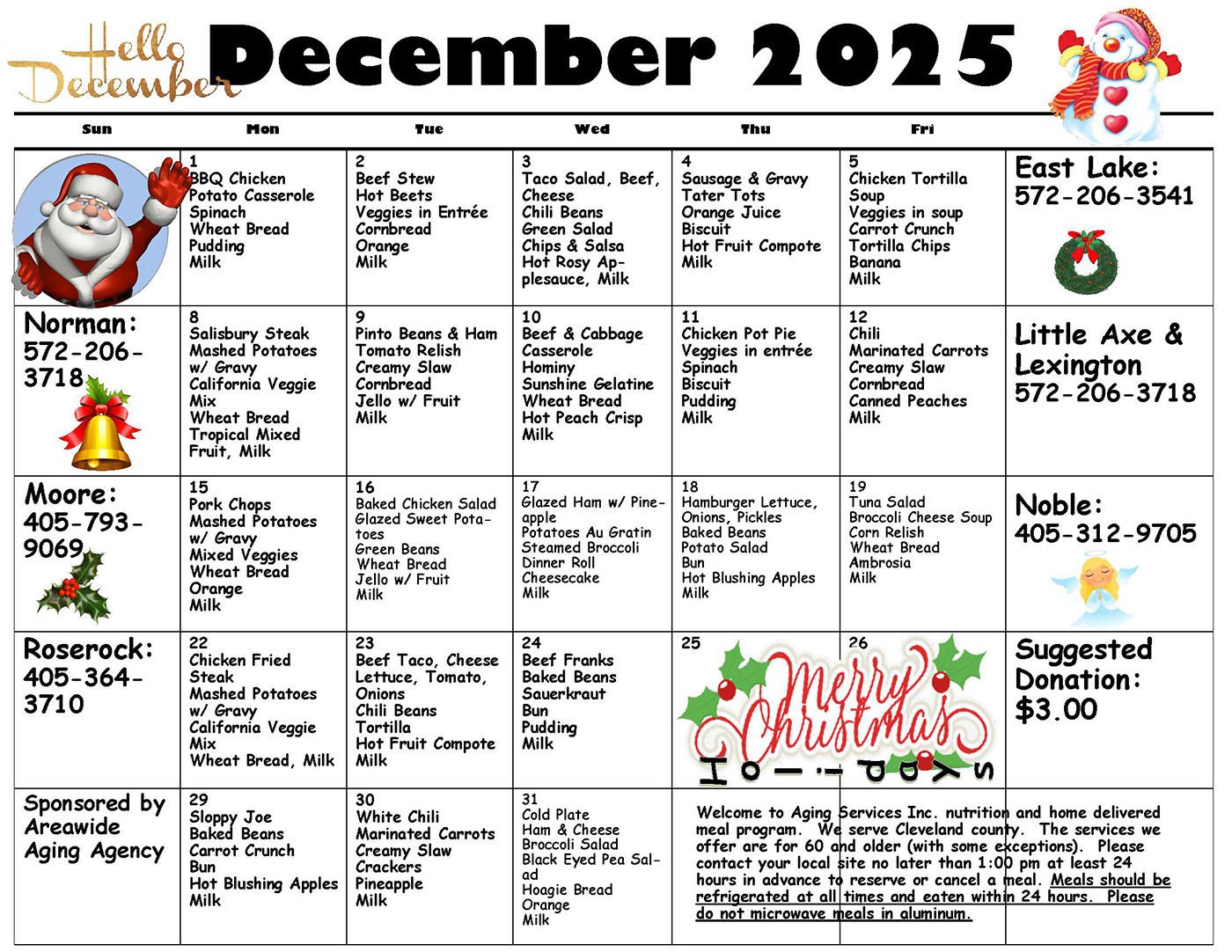 ASI provides lunch time meals, socialization, and educational programs Monday through Friday at five congregate meal sites throughout Cleveland County. There is a suggested donation of $3.00 for those age 60 and over and/or spouse of an individual age 60 and over. Adult disabled participants attending a meal site located in an independent housing facility are also eligible for a meal at the same suggested donation. There is a charge of $5.00 per meal for guests under 60 years of age.