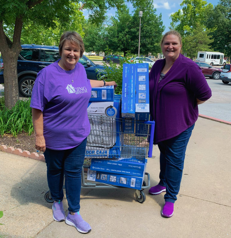 Shonda Harrison, Areawide Aging Agency and Tammy Vaughn, Aging Services, Inc. unload fans from the Oklahoma City OG&E Fan Program.