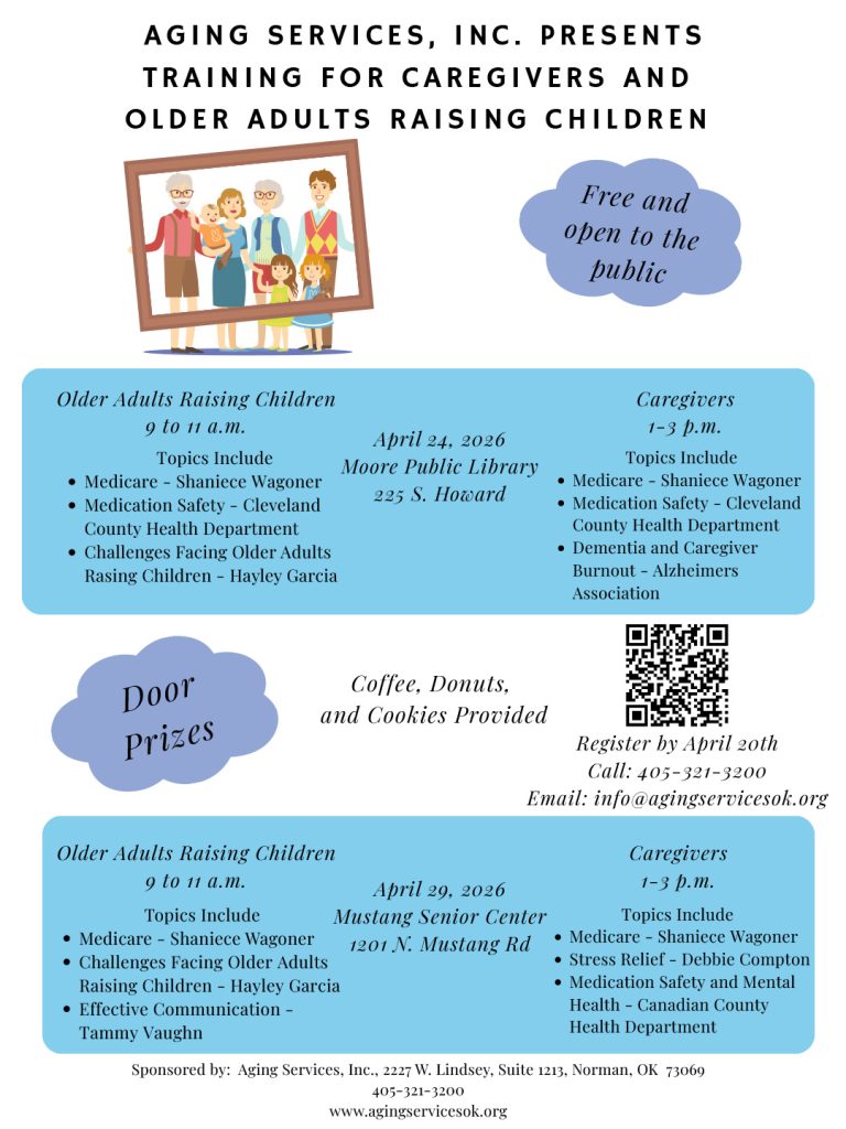 Sessions will be held on April 24 at Moore Public Library and April 29 at Mustang Senior Center, with topics including Medicare, medication safety, stress relief, dementia and caregiver burnout, effective communication, and the unique challenges older adults may face while raising children.